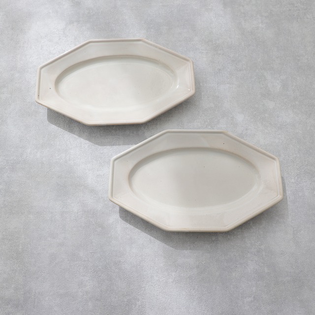 プレートだけで使う場合はローストポーク、カルパッチョ、ラザニアなど。 写真のように前菜にも使っていただきたいです。 プレートはボウルと一緒に重ね使いできるサイズ展開です。 盛り面はオーバルにし、全体の形は8角形にして角を出すことでボウルとのバランスをとっています。 サイズ W20.5cm D12.0cm H2.0cm 食洗機・電子レンジ使用可 目止め推奨 素材 陶器(白土)白釉還元 ・焼成の度合いや釉薬の性質上、色ムラや釉垂れ、焦げ感に個体差が生じます。 made in JAPAN