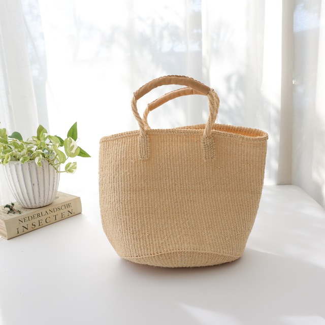 インチサイザルバッグに革ハンドルを付けました。 丸底タイプで物も入るので外出や通勤通学にも。 しっかりと細かく編んであるので大変丈夫です。 サイザル特有の素材感とナチュラルな風合いをお楽しみください。 【素材・成分】 サイザル 牛革 【生産地】 ケニア サイズ 約 底20x高さ25.5 ハンドル縁縁51 (cm)