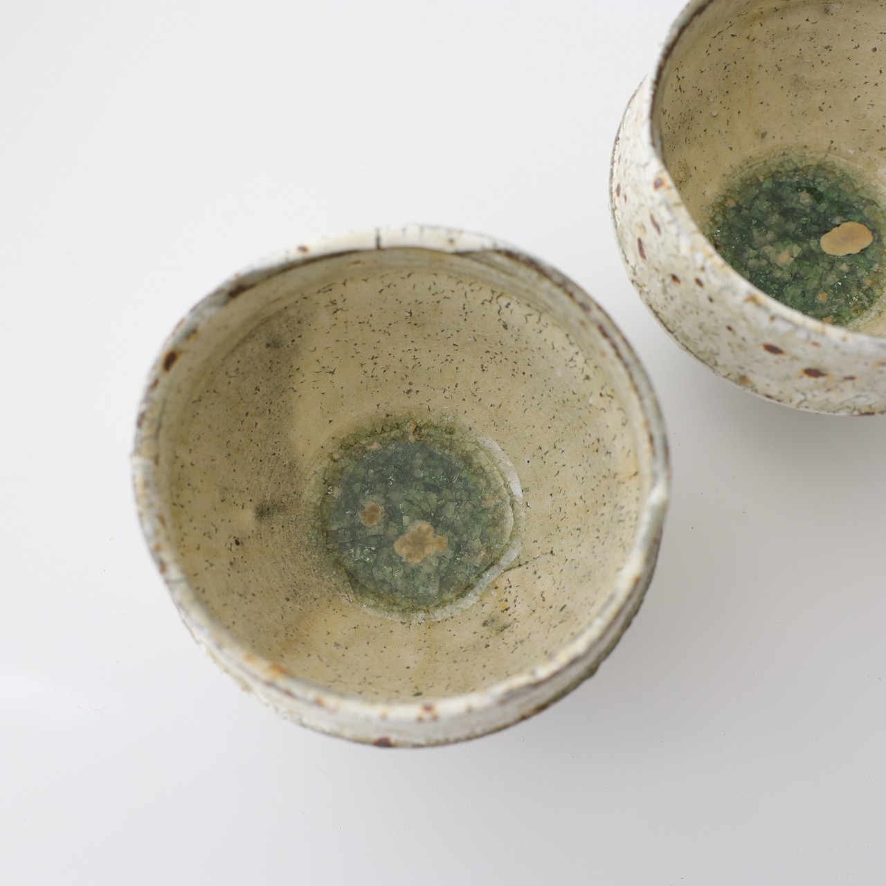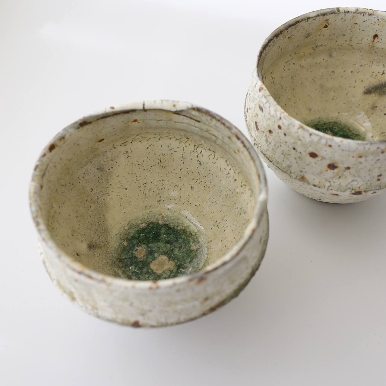作家による手作業で作られた作品のため、色合い、形、大きさ、重さ、絵柄の入り方、釉薬のムラなどが異なります。また、縁や底にみられる所々の凹みや、器表面に入った微細なキズや汚れ、ピンホール*や鉄粉*は、制作過程にできてしまう、自然な現象となります。