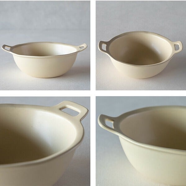 さりげなくついたハンドルが目を引く【ナル】シリーズ。ベージュとブルーどちらも角がなく、やわらかい形状。そして優しいマットなカラーリング。パスタなどの洋食から、和食を盛り付けてもいい感じに仕上がります。カジュアルな雰囲気なので、気兼ねなく毎日の食卓で活躍してくれるデザインです。