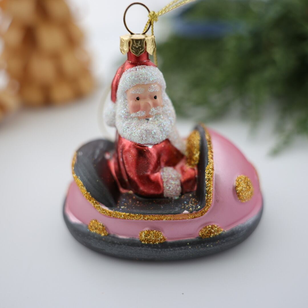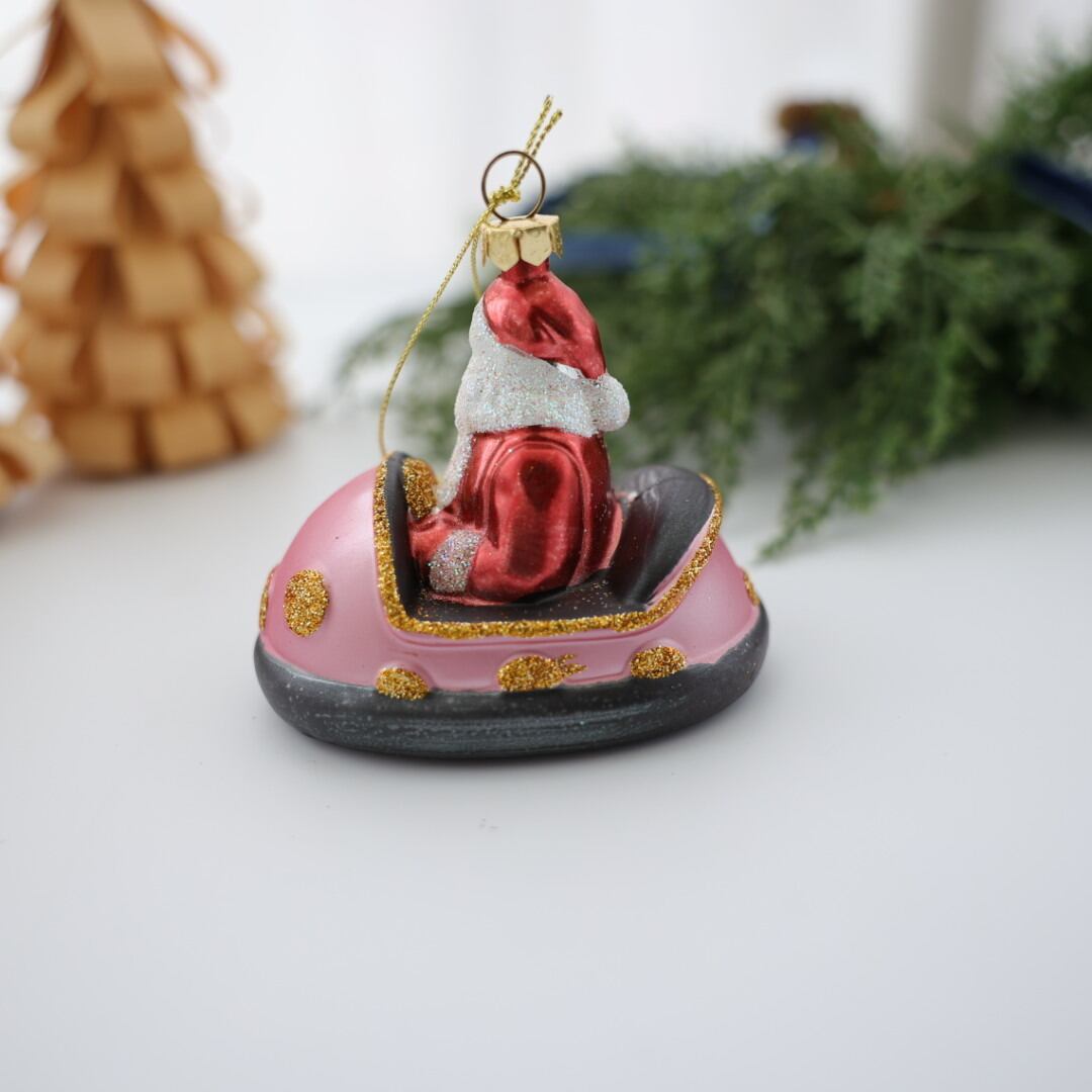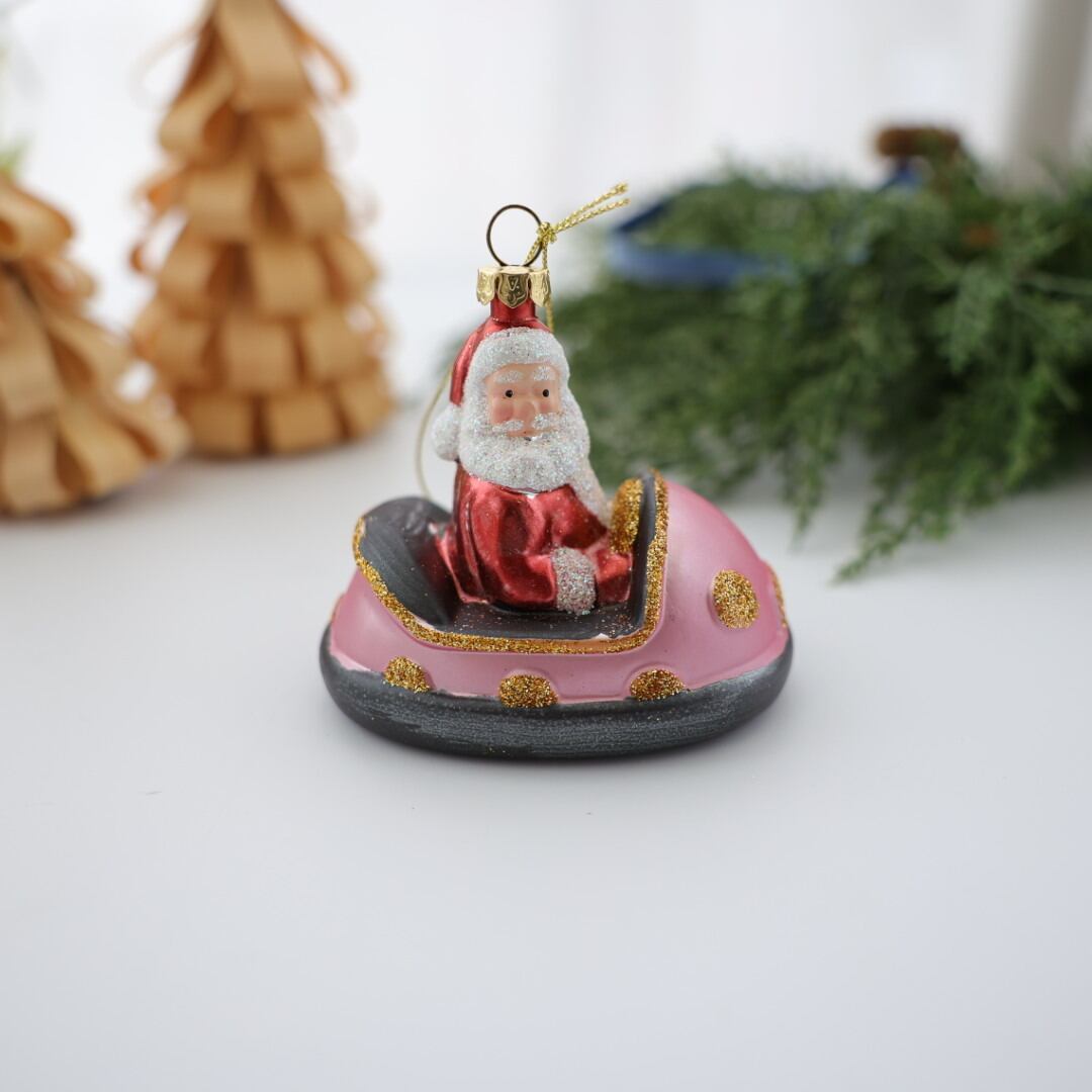 バンパーカーに乗って楽しそうなサンタの姿が可愛らしく、ツリーや棚に飾るだけで、にぎやかで楽しい雰囲気を演出してくれます。