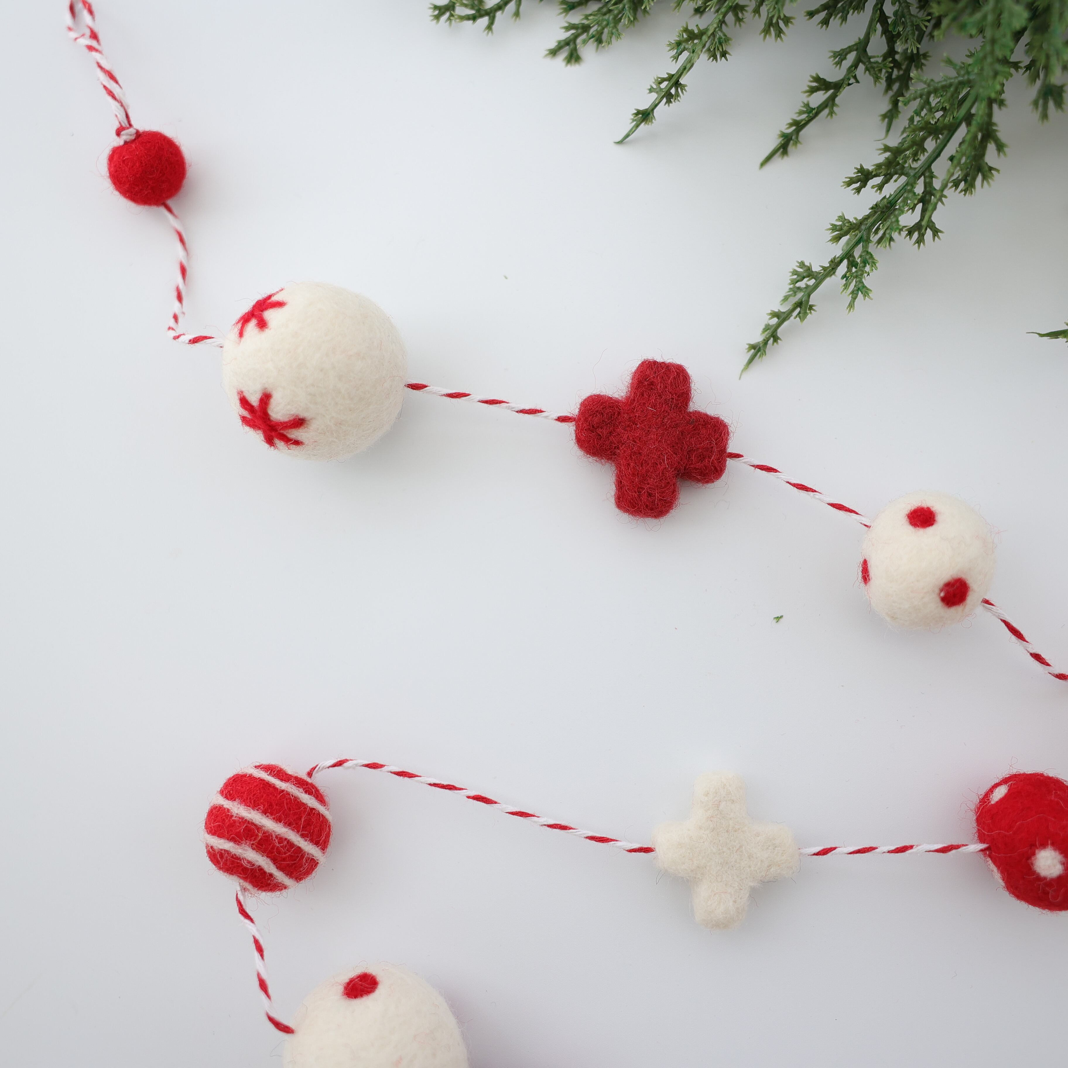 手作りのフェルトボールをつなげて作ったオーナメントひも飾り。