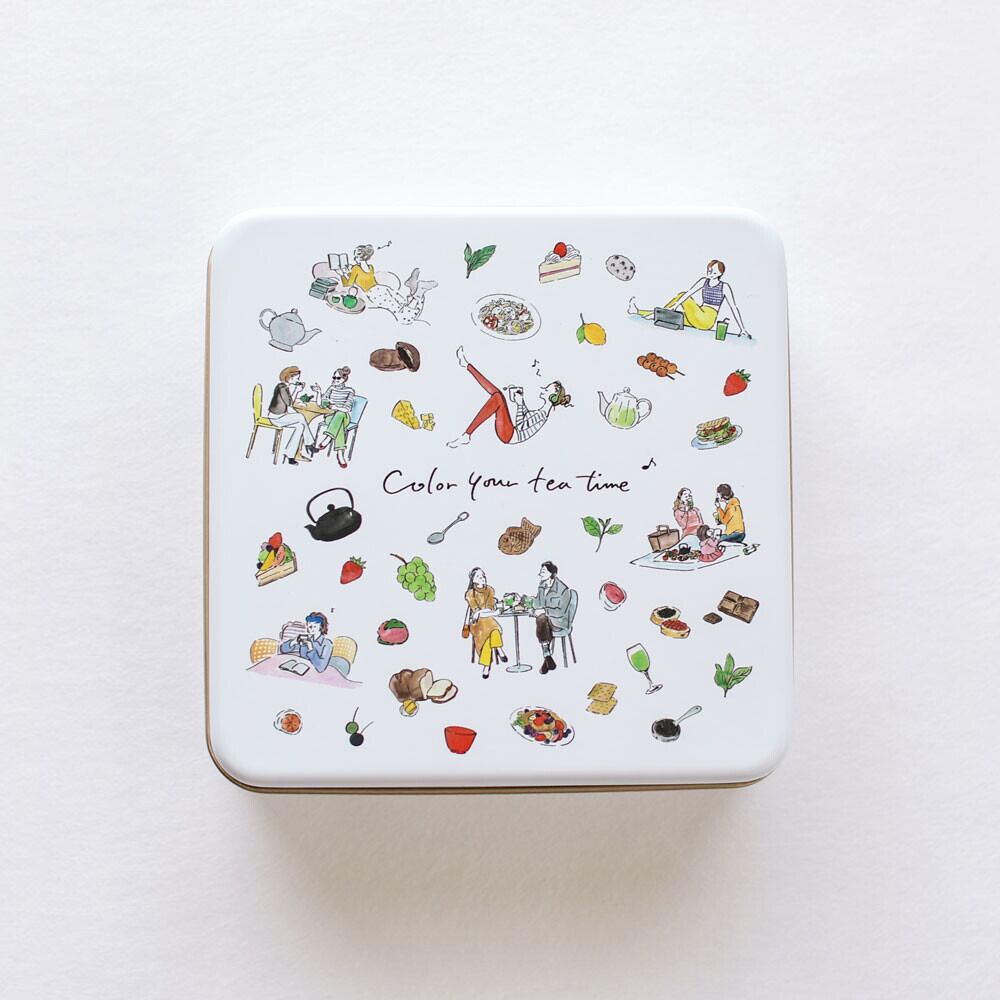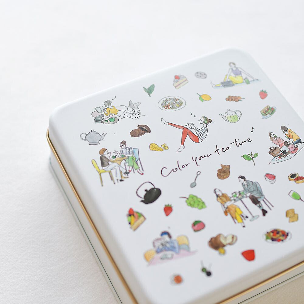 イラストレーター Natsu Yamaguchi氏書き下ろしによる、ティータイムをモチーフにしたイラストデザイン茶缶入り。