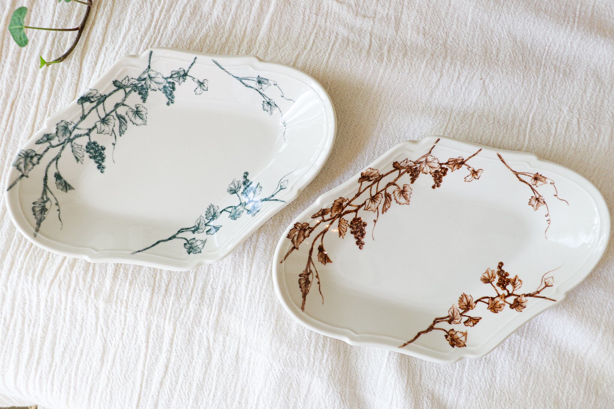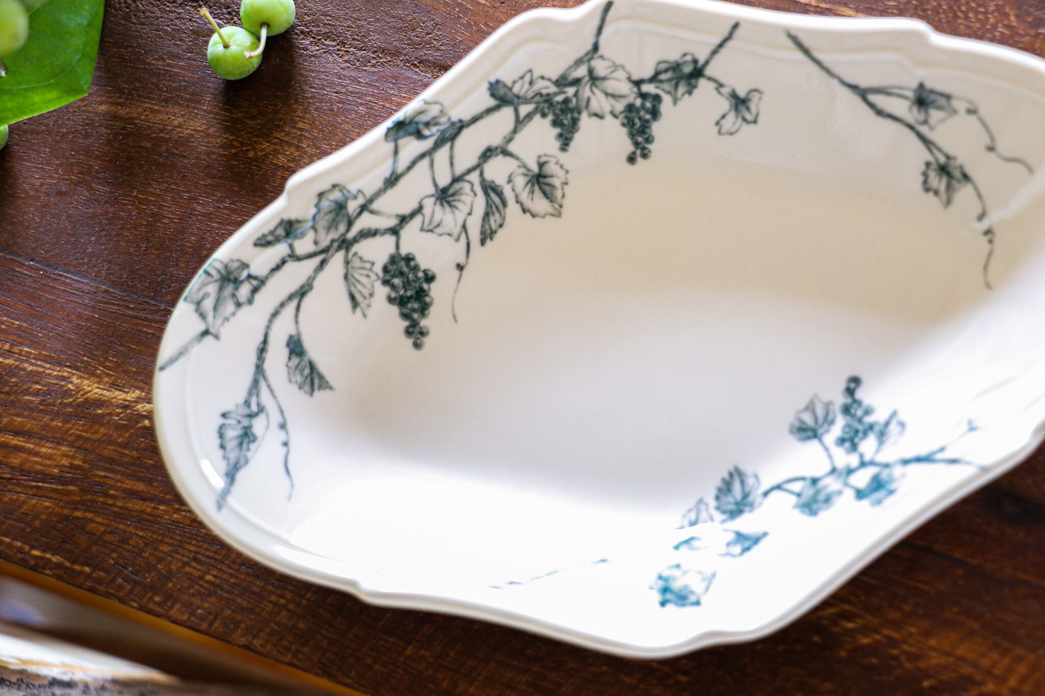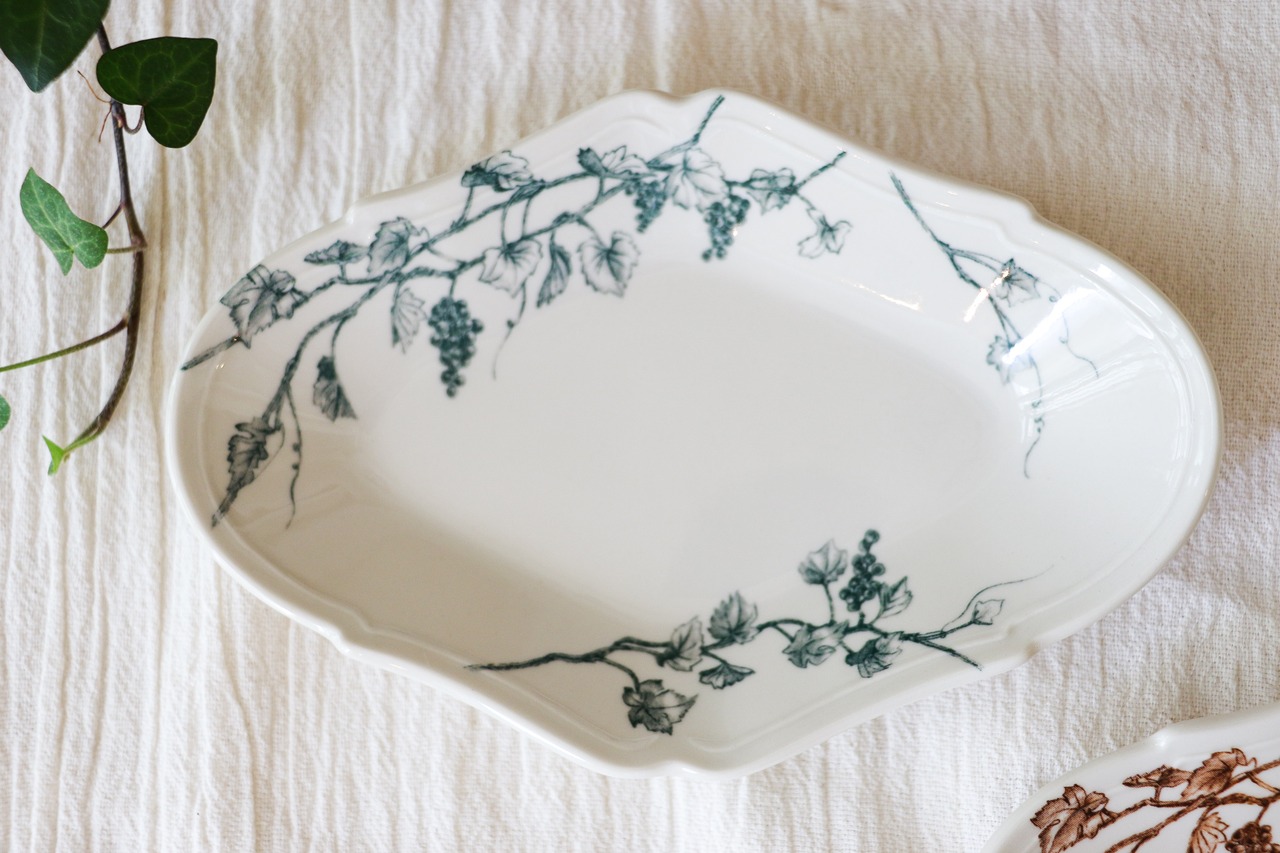 葡萄の枝や果実、伸びた蔓を大胆に配置し、料理と絵柄がより引き立てあうように。