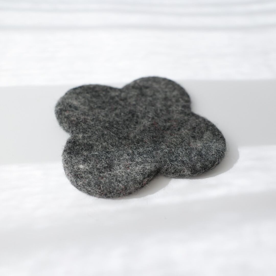 羊毛を縮絨(しゅくじゅう)フェルト化させ作った鍋敷き。水、特に石鹸水のようなアルカリ性の水溶液を羊毛を広げて含ませて圧力をかけ、もんだり巻いて転がしたりしフェルトにします。縮絨にはたいへんな手間隙がかかります。