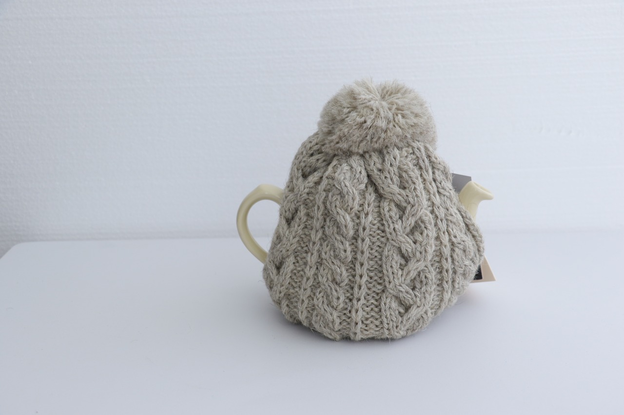丁寧な編み目がティーポットのコロンとしたフォルムを優しく包み混みます。