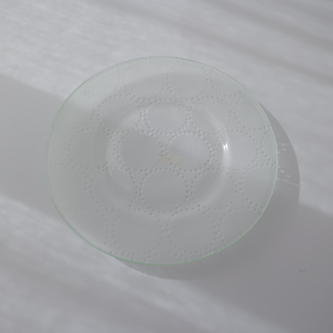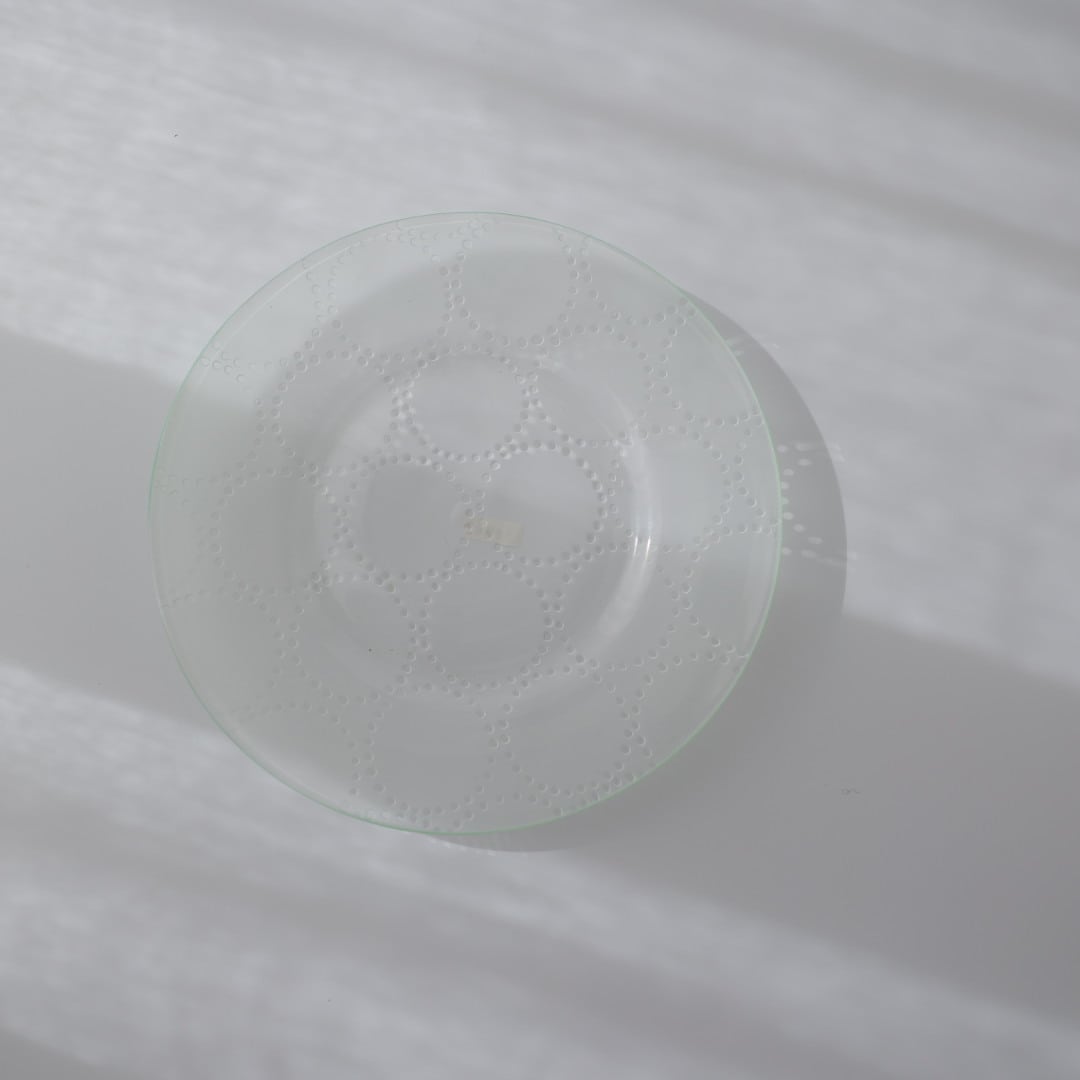 自身で吹きガラス制作した器にサンドブラストし模様を施している。