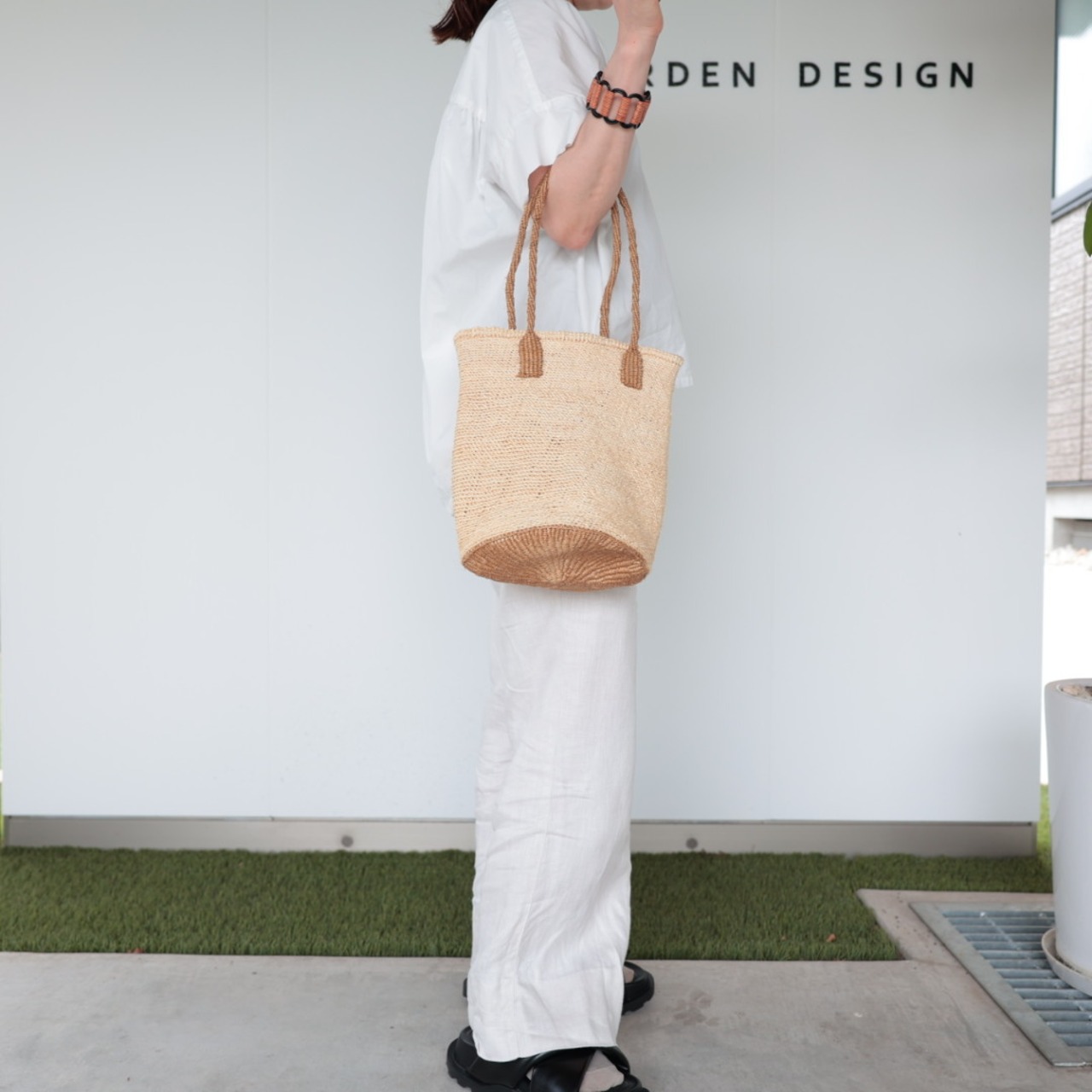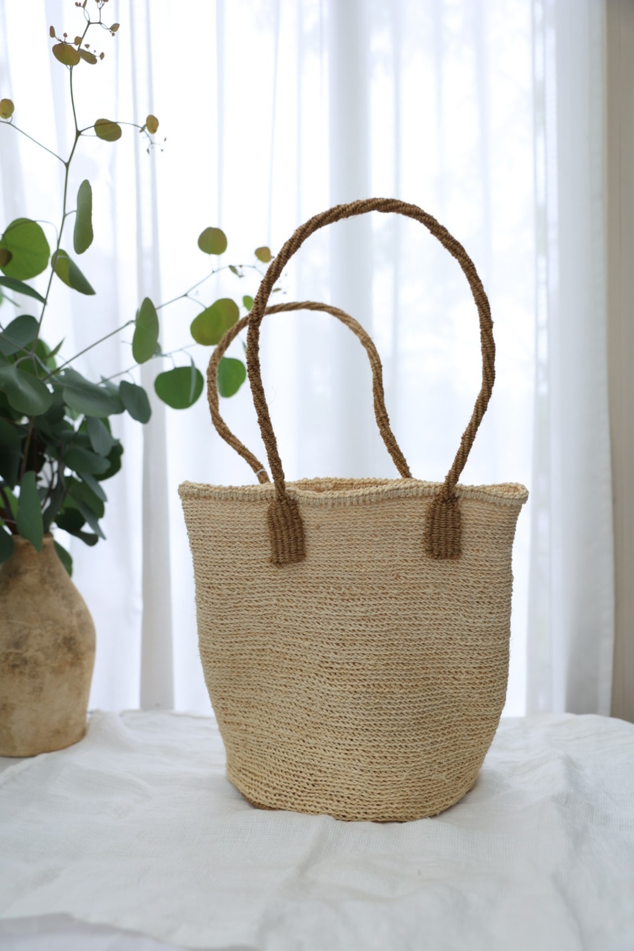 ムツリマと呼ばれる縦長タイプのバスケットに長めのハンドルを付けたサイザルバッグ。