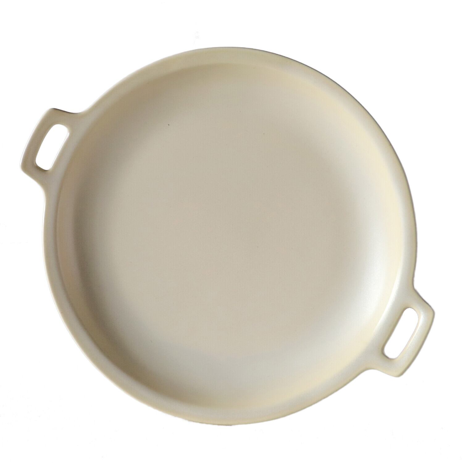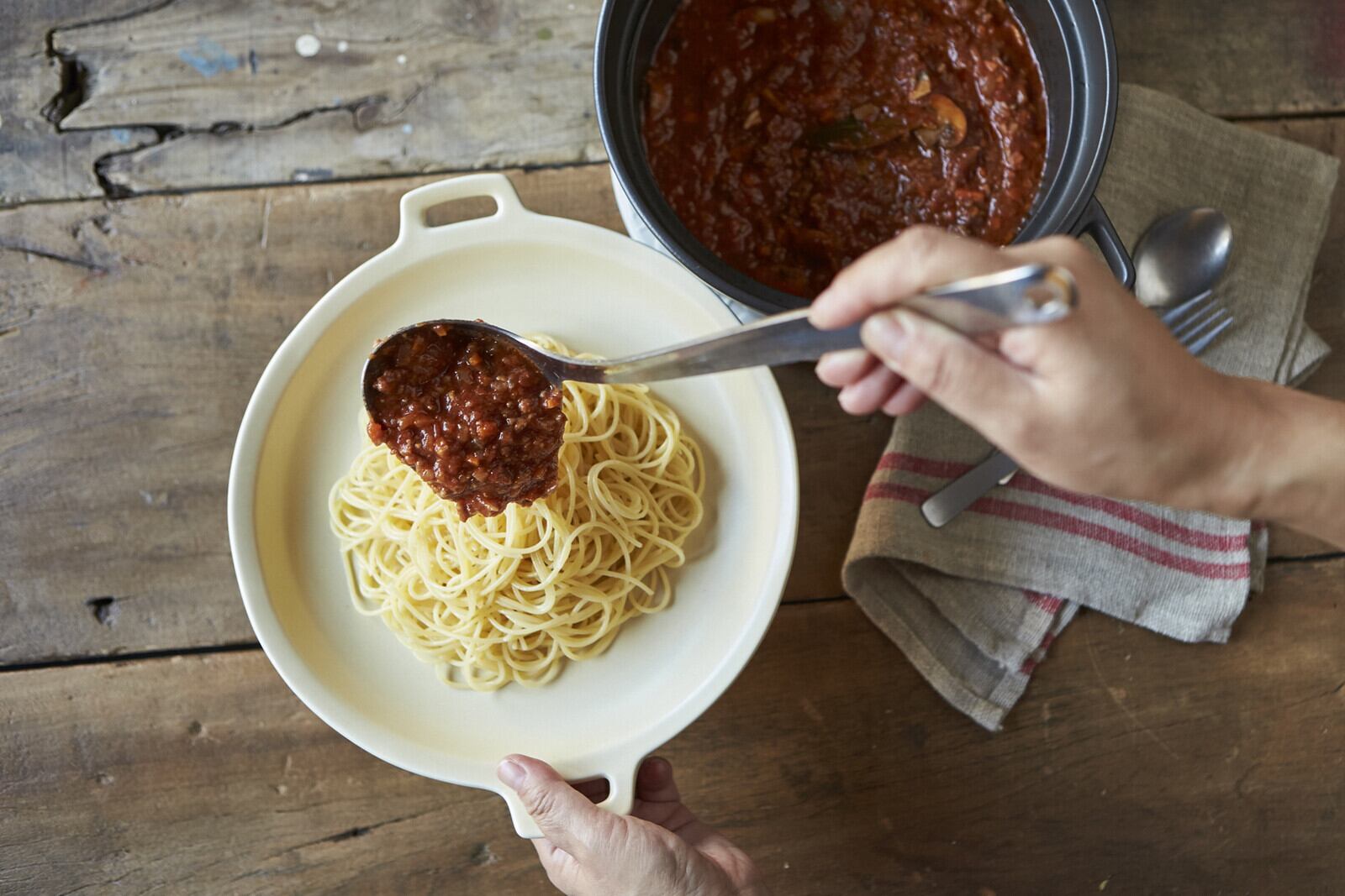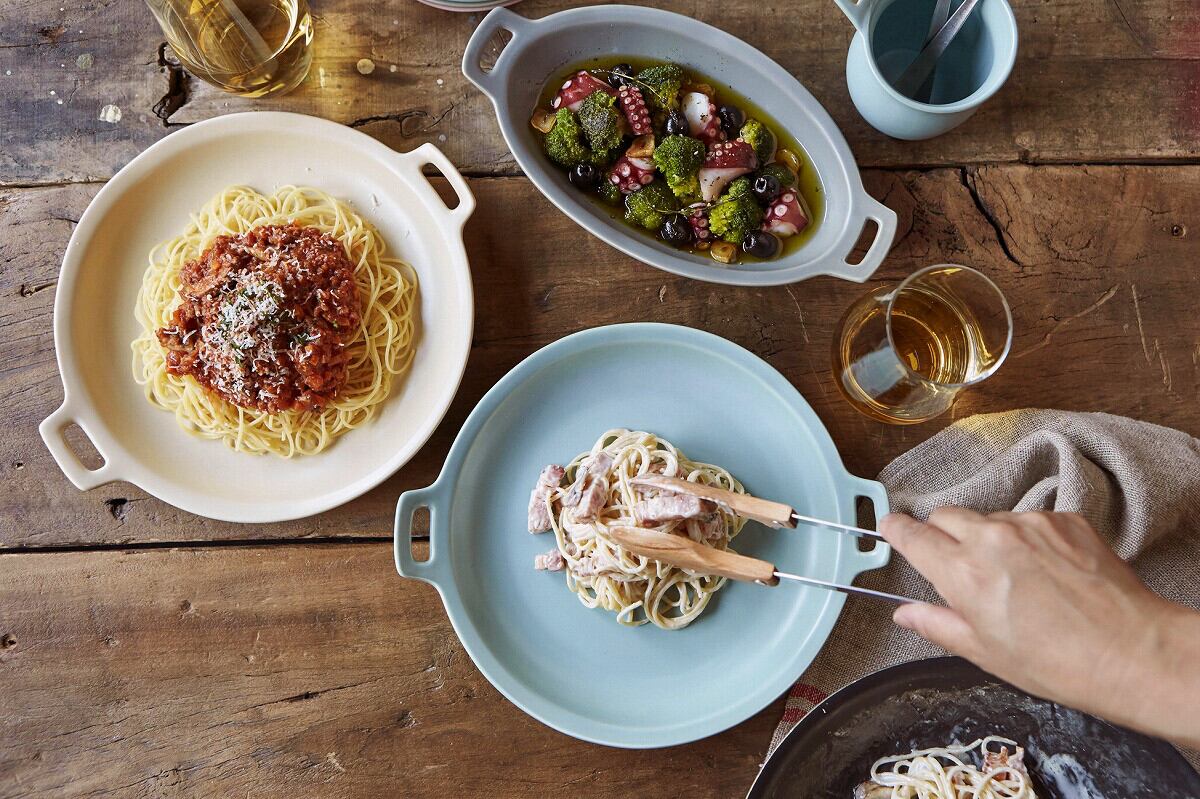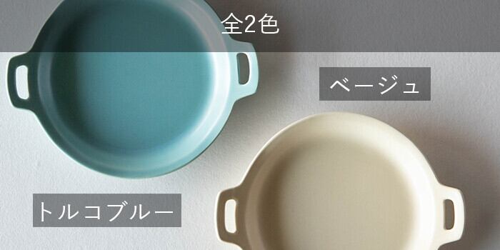 さりげなくついたハンドルが目を引く【ナル】シリーズ。ベージュとブルーどちらも角がなく、やわらかい形状。そして優しいマットなカラーリング。パスタなどの洋食から、和食を盛り付けてもいい感じに仕上がります。カジュアルな雰囲気なので、気兼ねなく毎日の食卓で活躍してくれるデザインです。