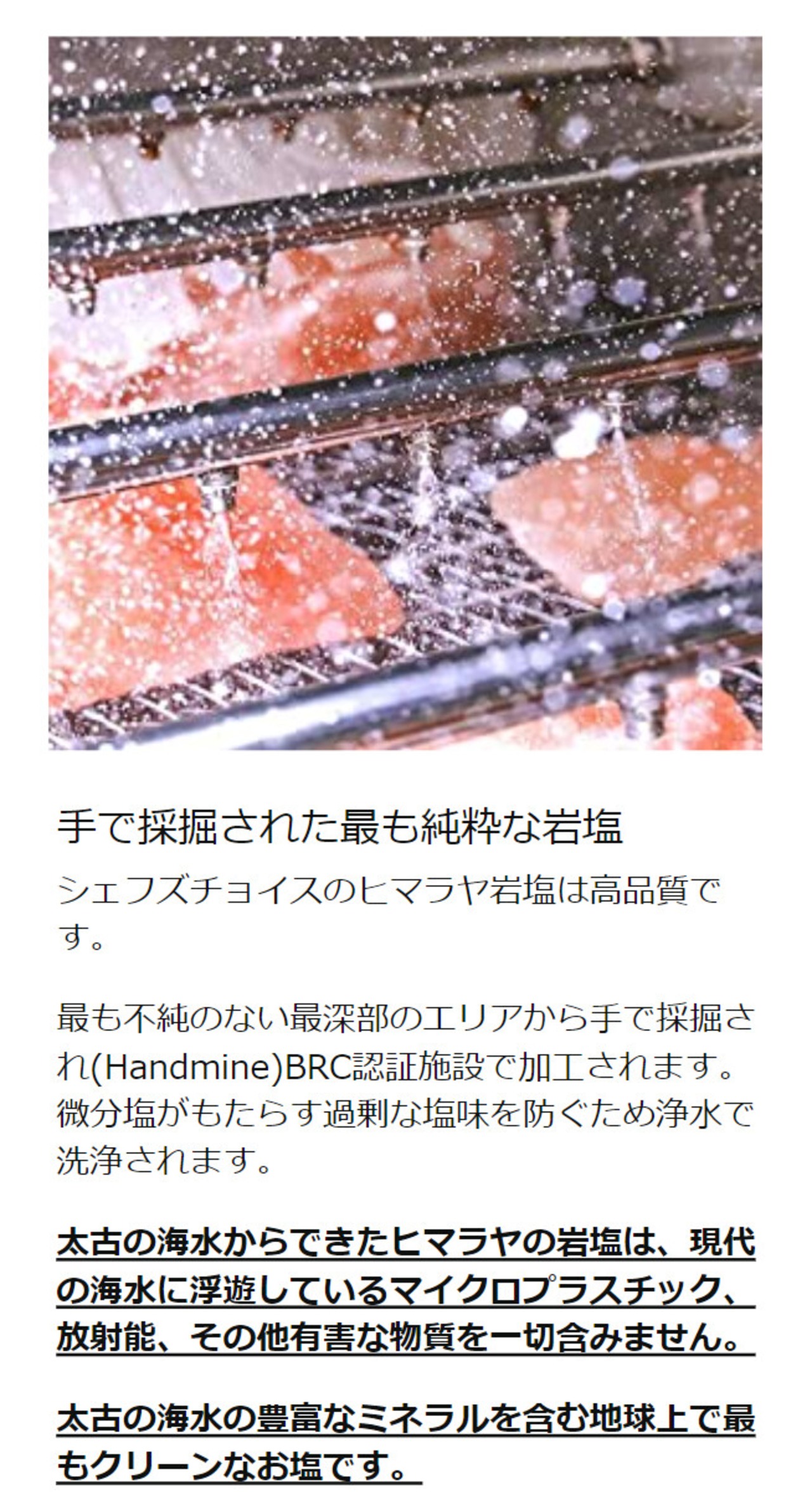 パキスタン岩塩山脈最深部から手作業で採掘しBRC認証施設で加工したハイグレード品質です。