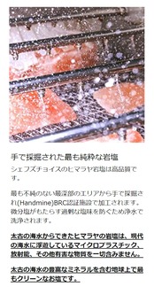 不純物を濾過した一般的な精製塩はミネラルバランスが悪く、内臓を硬くしてしまうなど健康被害が懸念されているが、ピンクソルトは太古の昔のピュアな海水そのままで電解質をバランスよく含み、もっとも安心できるお塩として認識されています。