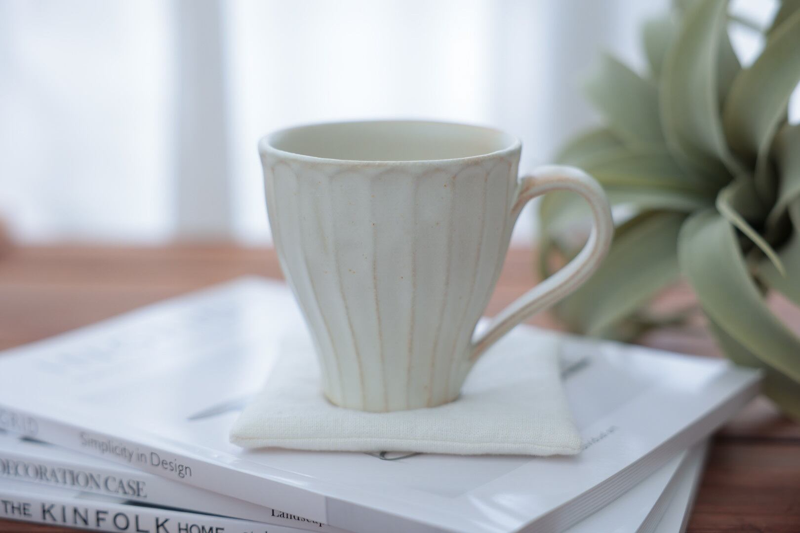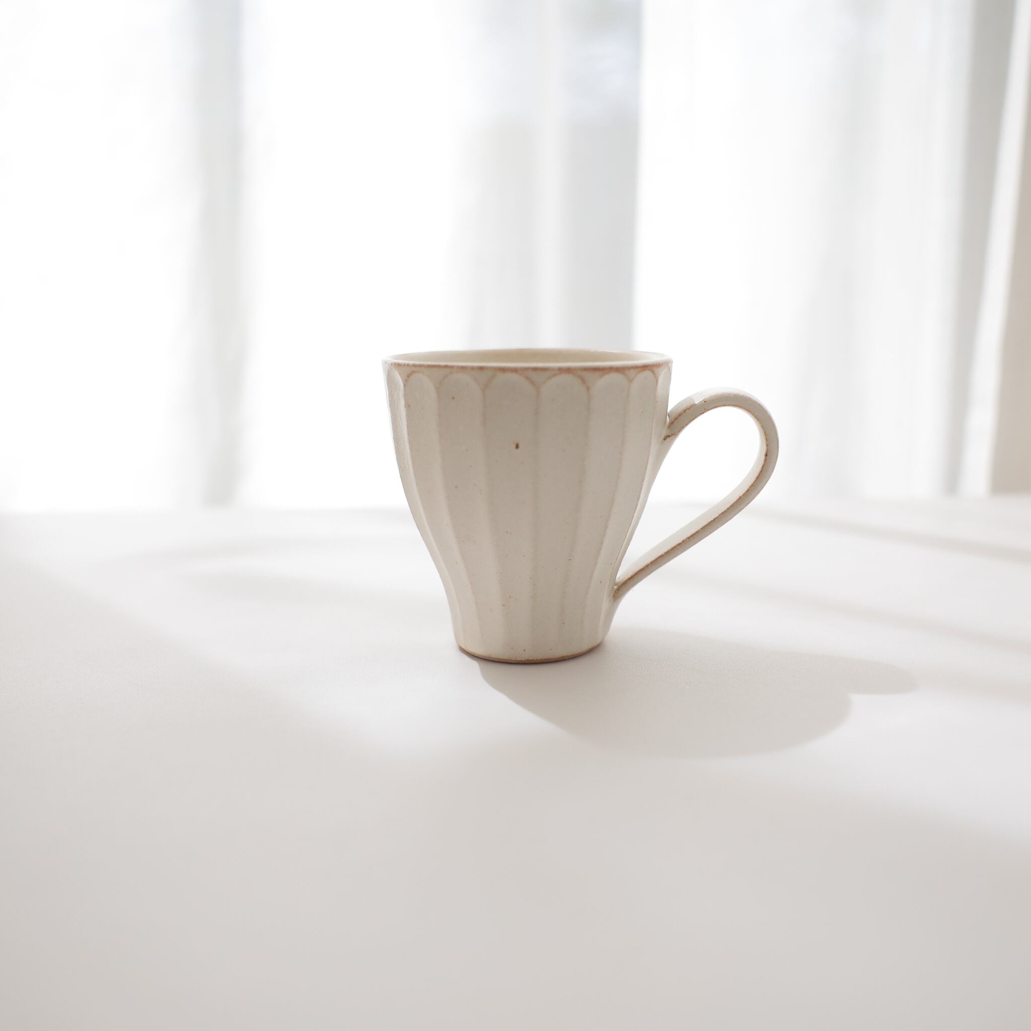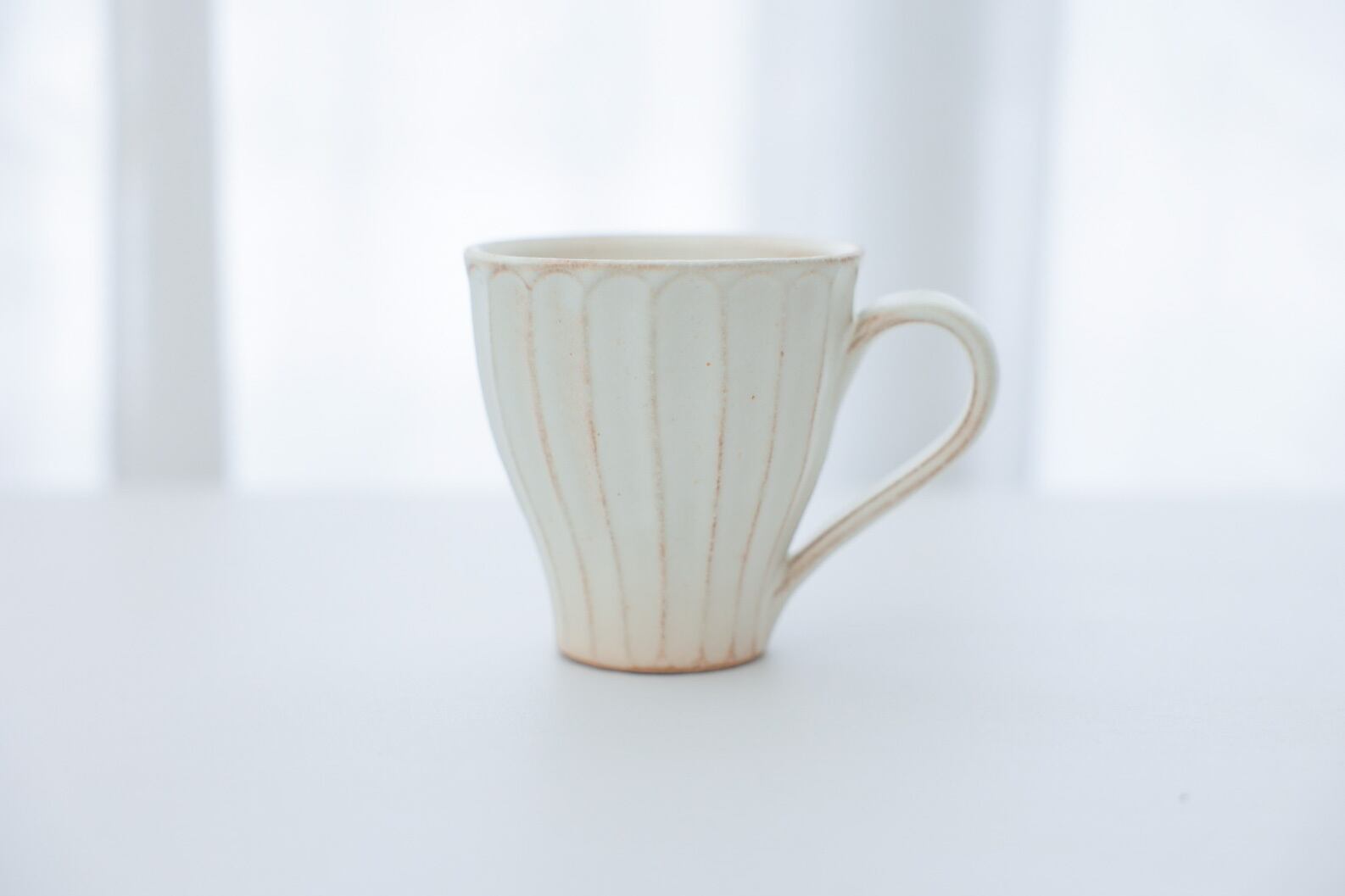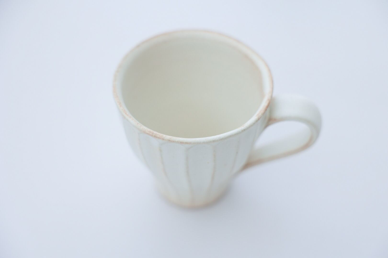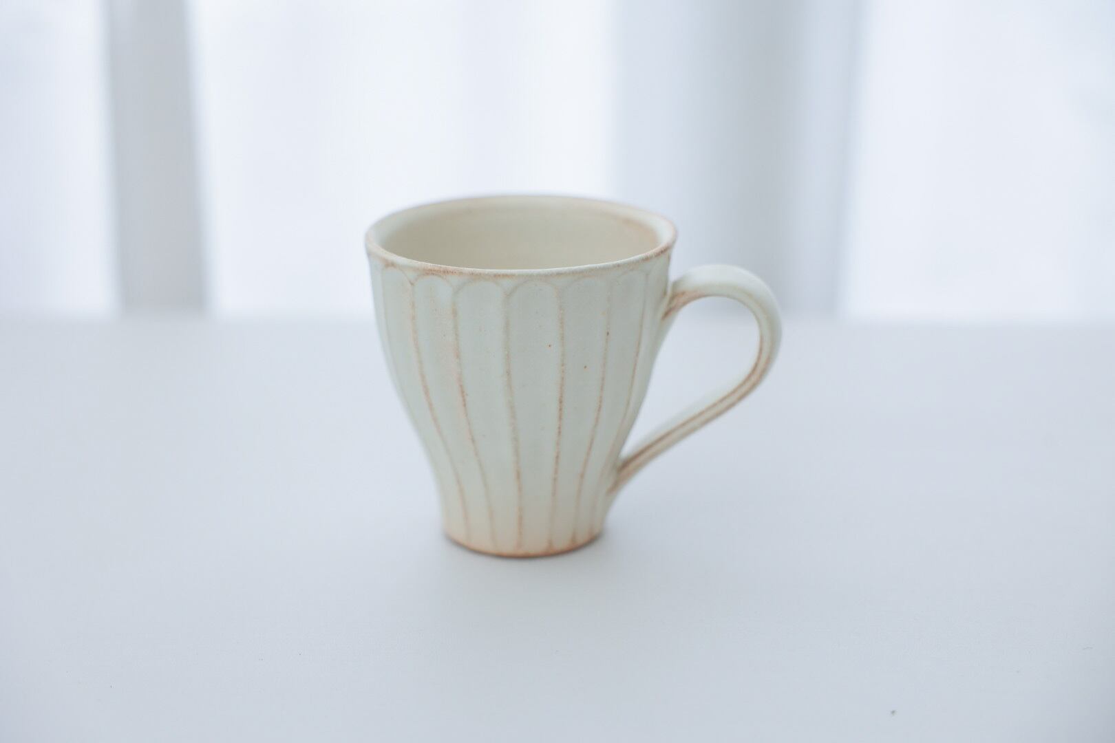 一つ一つ丁寧に手作りされた益子焼マグカップ。味わいあるしのぎ模様(線刻模様)にアイボリーがかった自然な生成り色がオシャレでモダンなマグカップです。