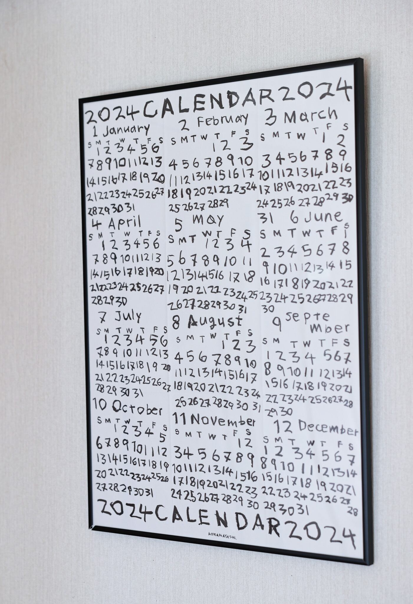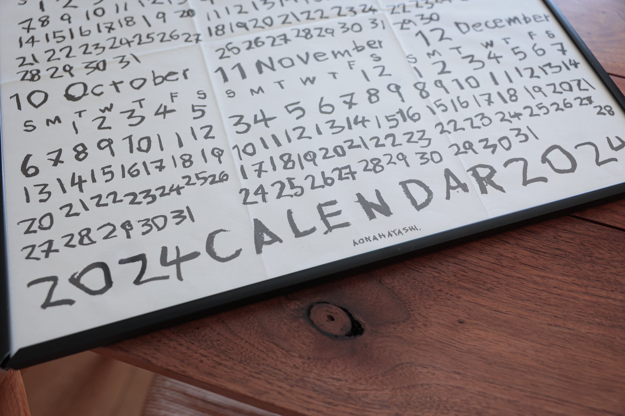 ひとつひとつの文字が踊るように描かれた大胆で魅力的なカレンダーです。